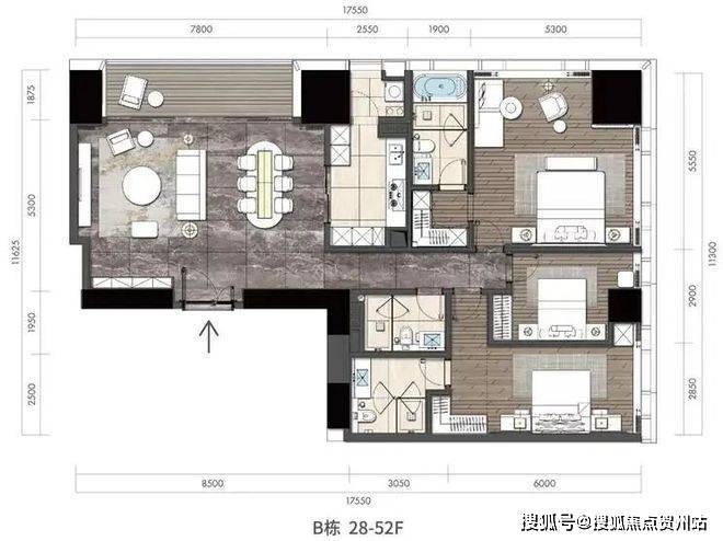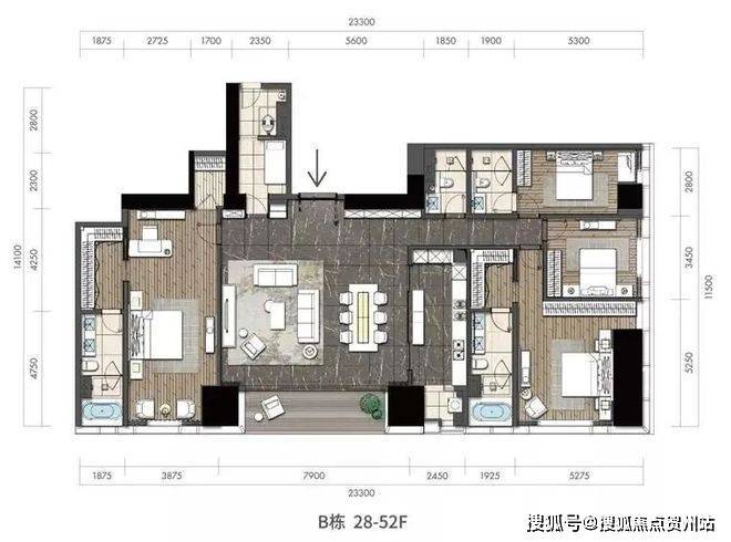 除此之外还有少量未公布的580㎡的超大面积产品。产品分段分布,162-164㎡户型分布在15-26层,223㎡以上户型分布在28-52层。