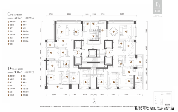 二、T4栋D东端头户型,面积330㎡,4+1房,备案总价3600万起;