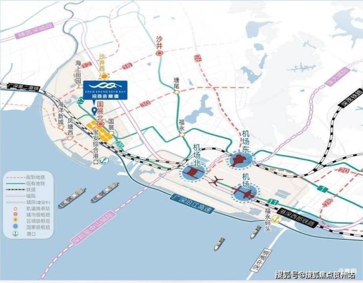 🛥海:直线距离约12km达机场码头,通往港澳;直线距离约3.5km达海洋新城超级码头(在建)