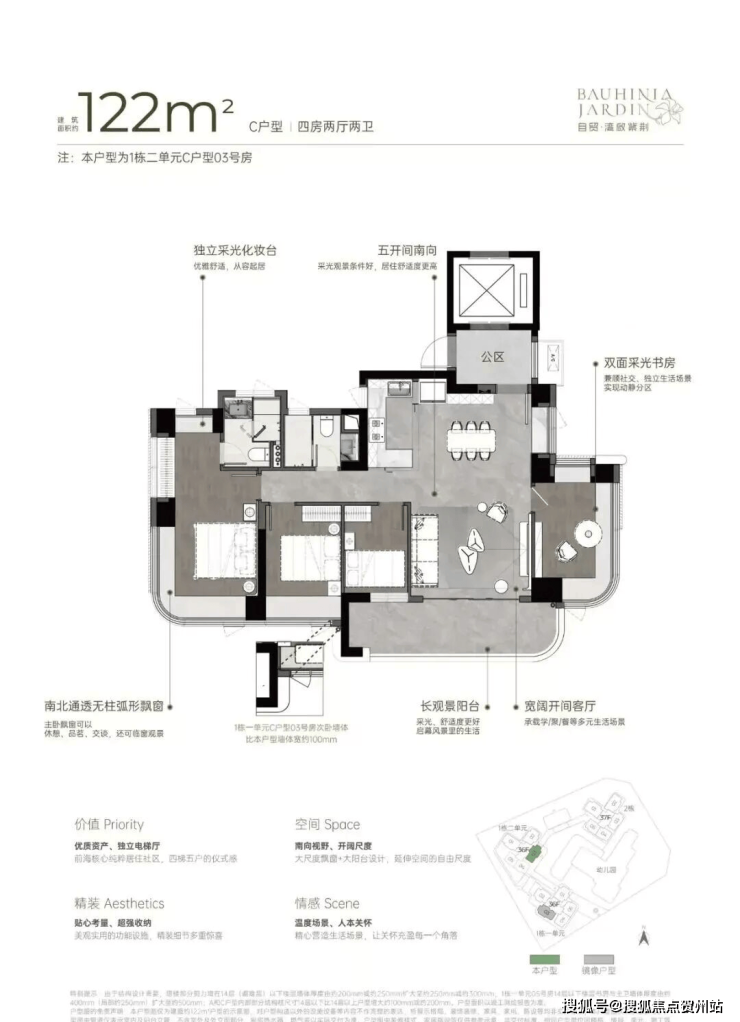 双龙抱珠户型,书房分布于客厅另一侧,且难得是双面采光+270°景观视野。主卧南北通透,且拥有十分开阔的景观面。贯通式阳台联通客厅以及靠近动区的次卧,实现长观景阳台