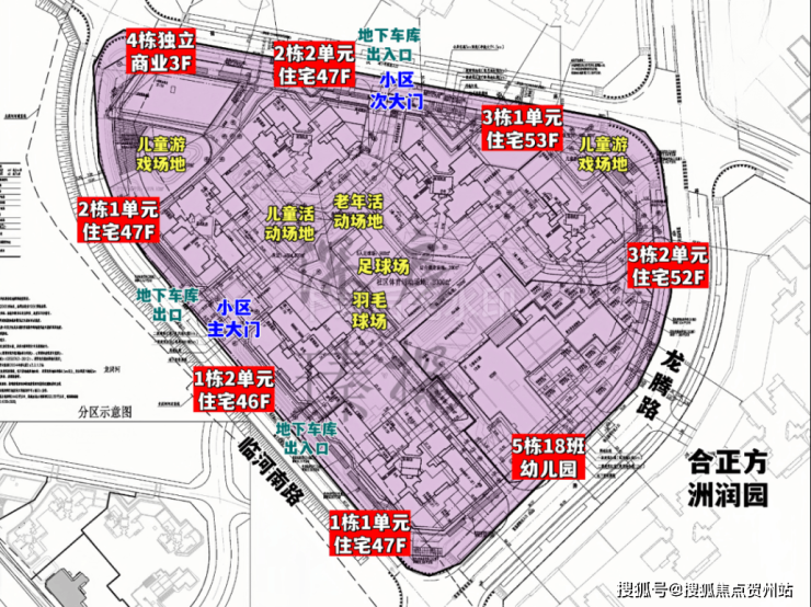 合正方州瀚府,总占地面积约3.05万㎡,总建筑面积约27.4万㎡,计容建筑面积约20.11万㎡,容积率6.6,绿化率40.01%,共由6栋总高46-53层的住宅组成,其中1栋1单元/2栋1/2单元住宅47F,1栋2单元住宅46F,3栋1单元住宅53F,3栋2单元住宅52F,5栋是1所18班制幼儿园,园区内规划有多个儿童游戏场地,羽毛球场,足球场。