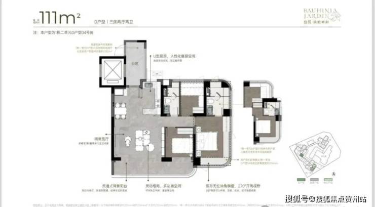111m²三房两厅两卫的D户型:竖厅格局,得房率约92-100%(含赠送),朝向为西南或东南。