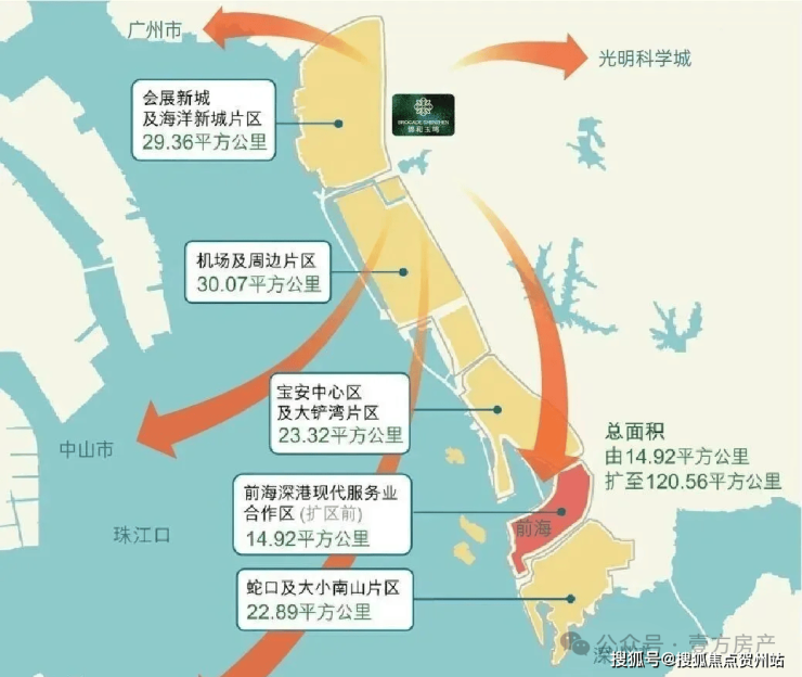 前海展翼:宝安作为湾区发展的桥头堡和主力军,深挖城市发展潜力,明确三城发展目标在前海“扩区”重磅落地之后,宝安1/5的范围加入前海,前海2/3的范围落在宝安,宝安一跃成为国家战略主战场。