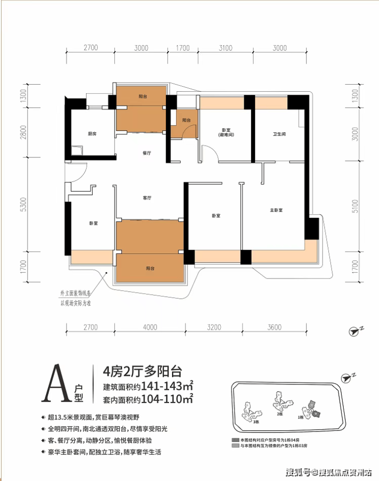 143㎡四房两厅两卫:改善四房,南北对流,总价 358-390 万。
