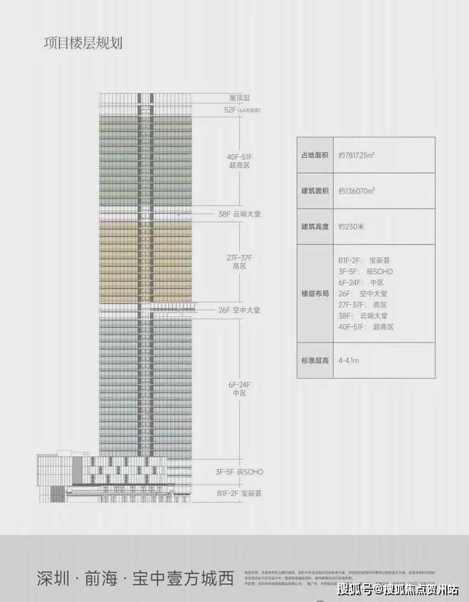 华侨城宝辰总高230米,为宝中最高楼;项目52层,分为中区、高区、超高区,6层起卖,11、39F为避难层,25-26F为空中会所,28F为空中大堂。除了空中大堂项目还有地下入库大堂+首层大堂,一共三重大堂。