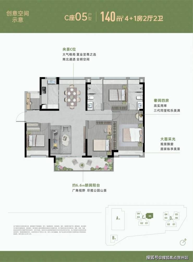 140平的4+1房,那个”+1“可以做储物间,收纳空间一下多了很多,如果需要还可以做个小书房,就有了一个独立不被打扰的空间。另外,这个户型有超大阳台,南北通透,值得改善家庭拥有。