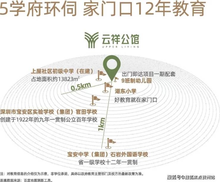 对于刚需家庭来说,还有个必不可少的要求就是学校,言成云祥公馆周边学府环绕,小区内就有九班制幼儿园,小区隔壁就是湖东小学,小区马路对面就是在建的上屋初级中学,另外,直线距离约500米的范围内,还有宝安中学(集团)石岩外国语学校和宝安区实验学校官田学校,后者是深圳11所百年学府里面的一所,历史悠久,扩班后有108班。