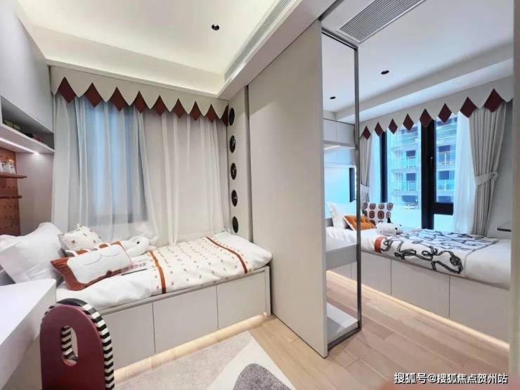 在户型设计上,开发商也做到了高使用率,特别值得推荐的是建面约99平的“3+1”经典设计,它有两个房间是打通后合在一起的(如下图),特别适合家里有两个孩子的家庭,小时候可以两个孩子一起睡在一个房间里,如果孩子大了,可以用墙将两个房间隔离开来,这样孩子就有了自己的独立空间;如果只有一个孩子,在孩子小的时候,大人则可以睡在隔壁床上随时照料孩子,等孩子大点可以将隔壁房间变成孩子的游戏乐园,等孩子上学,则可以在那里摆上书桌。