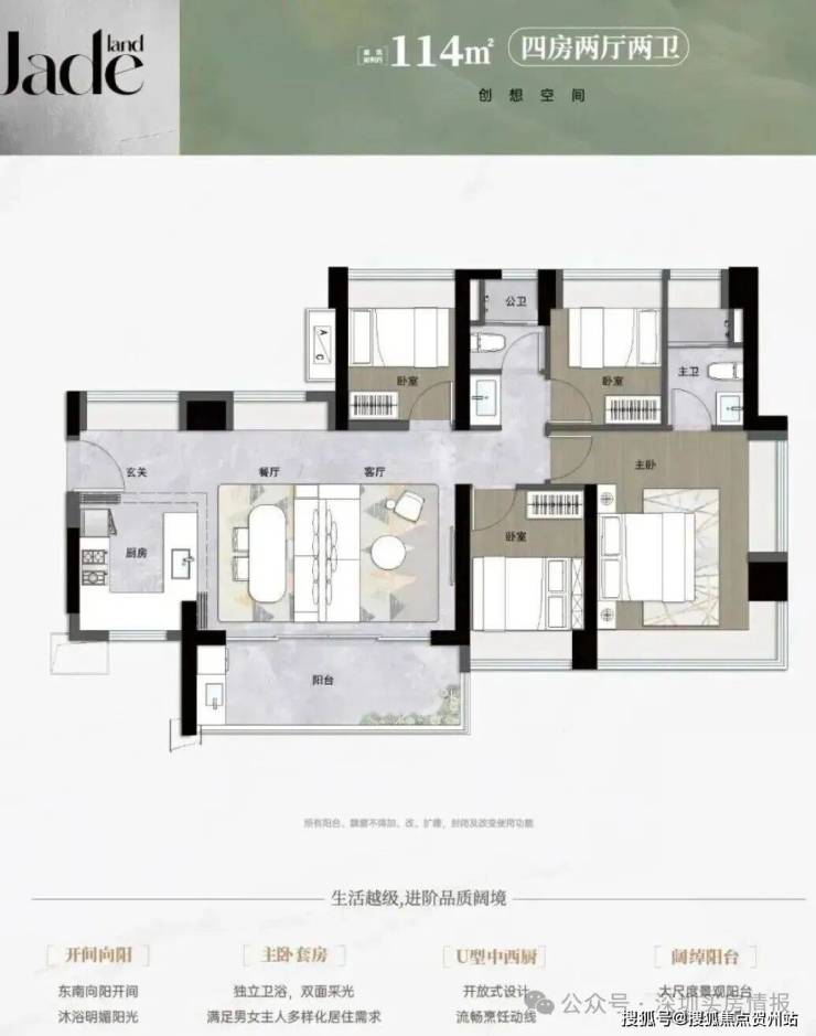 114平㎡的4房2厅2卫,设计的是横厅南北通透格局,进门入户玄关,LDKB一体化,五开间朝南,全屋9面飘窗,主卧大套间,U型厨房,卫生间干湿式分离,得房率约92%(包含赠送),阳台主朝东南向。