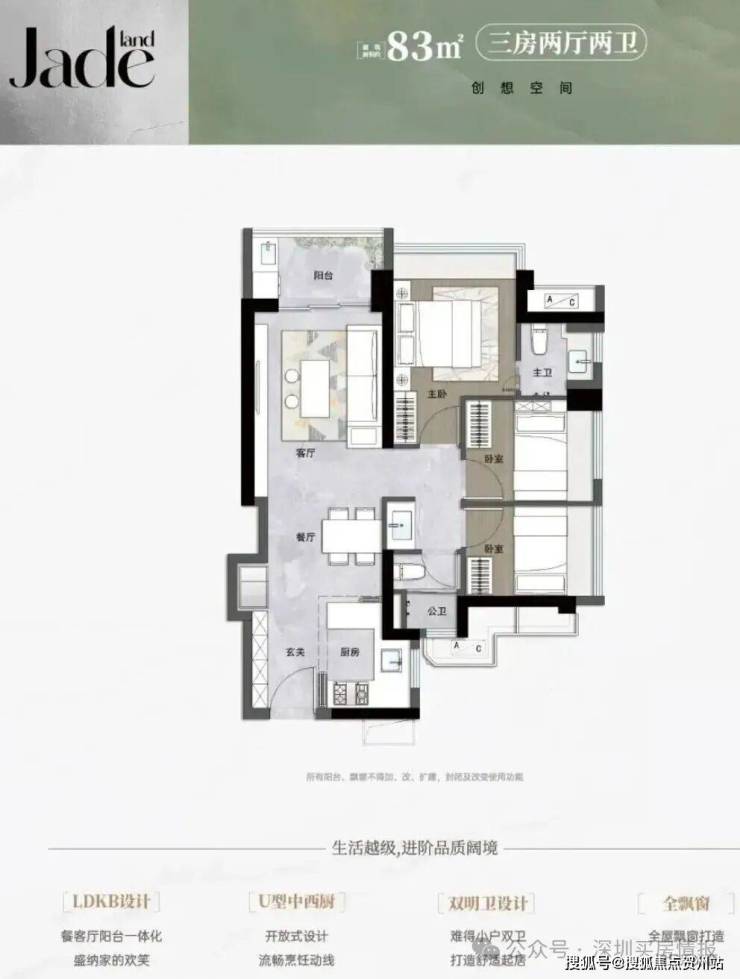 5栋83㎡的3房2厅1.5卫,设计的是竖厅格局,进门入户玄关,LDKB一体化,S墙设计预留冰箱卡槽位,U型厨房,主卫少了淋浴,公卫三段式分离,得房率约92%(包含赠送),阳台西北朝向。