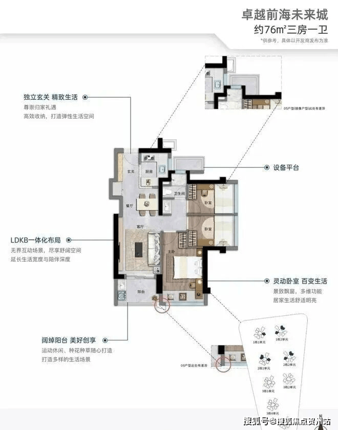 76㎡的3房2厅1卫,设计的是竖厅格局,进门入户玄关,客厅3.05米开间,LDKB一体化,S墙设计预留冰箱位,3个卧室分别做到了2.95米/2.3米/2.15米的宽度,U型厨房,卫生间三段式分离,还带1个设备平台可以使用,得房率约:89%(包含赠送),阳台有朝东北、东南或西南向