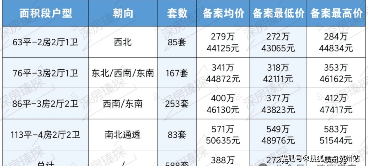 宝安沙井,卓越前海未来城(备案名:蔚蓝海尚花园)于2025年4月18日取证入市,本次推出1栋1/2单元,共588套房源,面积有63㎡的2房1卫,76㎡的3房1卫,86㎡的4房2卫,113㎡的4房2卫户型,备案均价4.59万/㎡,备案单价4.21-5.15万/㎡,总价272-583万/套,预计在2026年12月份带精装交房。