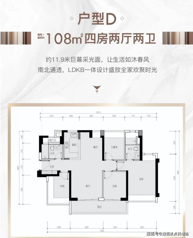 108㎡的4房2厅1卫(户型D),设计的是竖厅南北通透格局,进门入户玄关,客厅3.6米开间,LDKB一体化设计,4个卧室分别做到了3.2米/2.6米/2.5米/2.35米的宽度,主卧加1个次卧270°飘窗设计,U型厨房,得房率:77.51%(不含赠送),阳台主朝西南向。