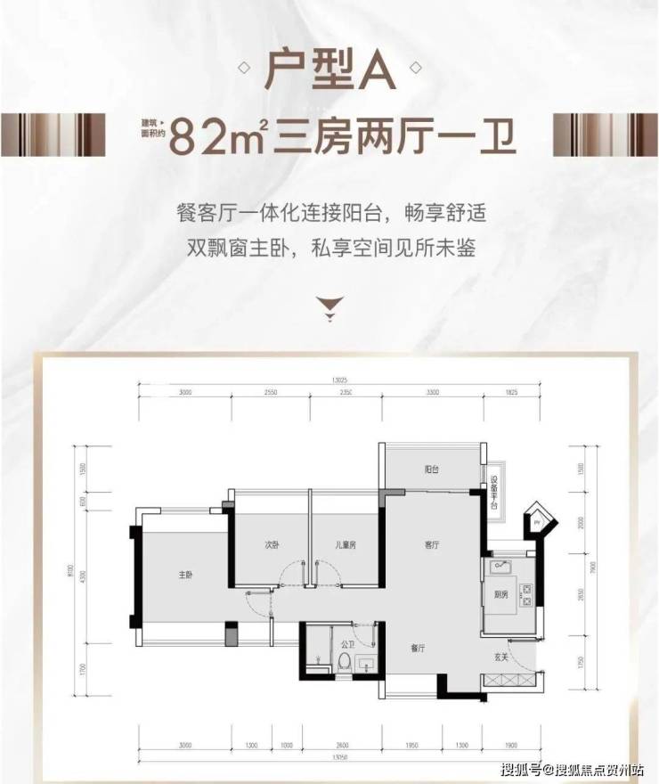82㎡的3房2厅1卫(户型A),1栋/3栋1单元的05户型,设计的是竖厅南北通透格局,进门入户玄关,客厅3.3米开间,LDKB一体化设计,3个卧室分别做到了3米/2.55米/2.35米的宽度,主卧双飘窗南北通设计,U型厨房,得房率:77.51%(不含赠送),阳台主朝东北向。