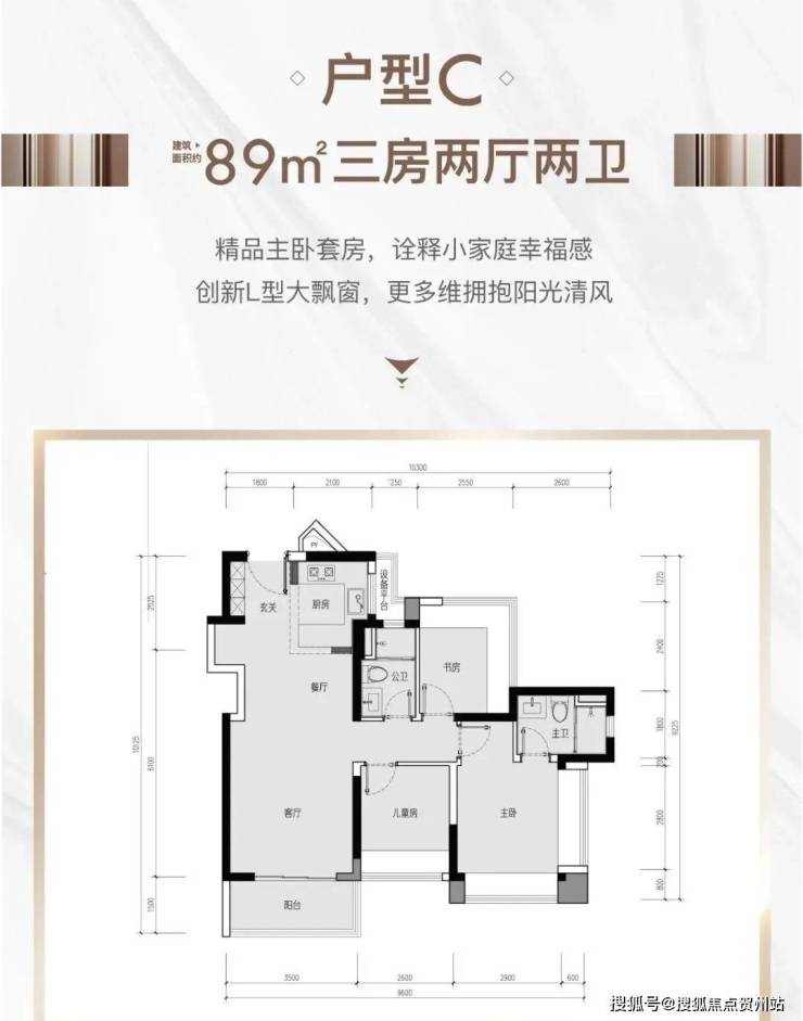 89㎡的3房2厅1卫(户型C),设计的是经典竖厅格局,进门入户玄关,客厅3.5米开间,LDKB一体化设计,动静分区,3个卧室分别做到了3.5米/2.6米/2.55米的宽度,主卧加1个次卧270°飘窗设计,U型厨房,得房率:77.51%(不含赠送),东南、西南或西北朝向。