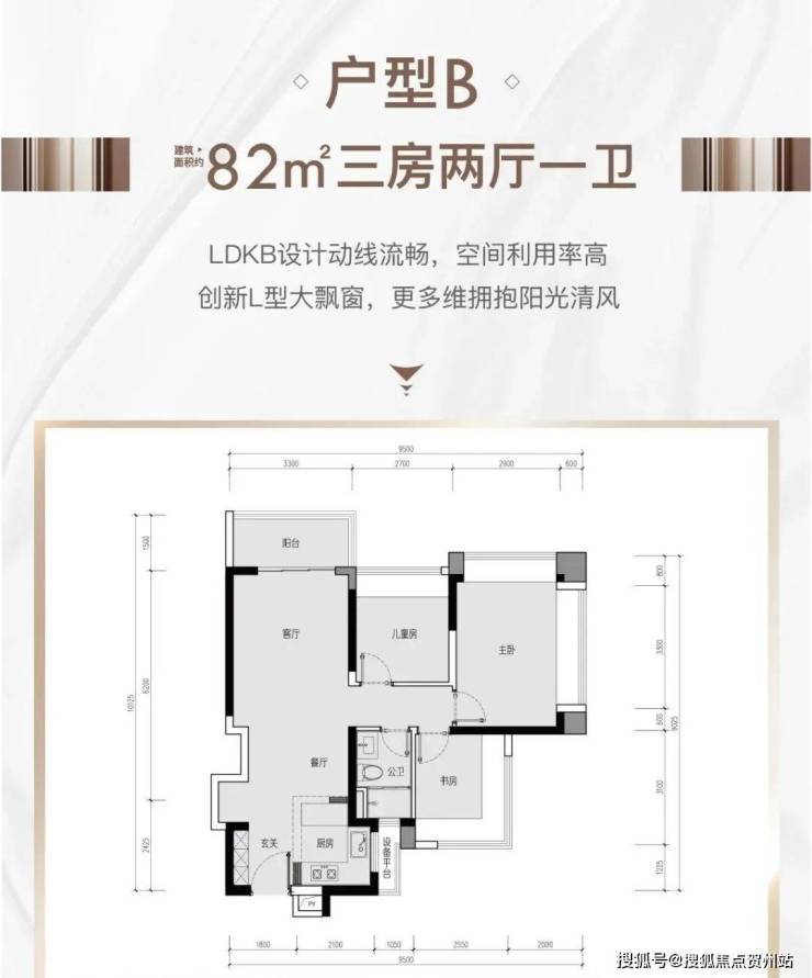 82㎡的3房2厅1卫(户型B),设计的是经典竖厅格局,进门入户玄关,客厅3.3米开间,LDKB一体化设计,动静分区,3个卧室分别做到了3.5米/2.7米/2.55米的宽度,主卧加1个次卧270°飘窗设计,U型厨房,得房率:77.5%(不含赠送),全部东北朝向。
