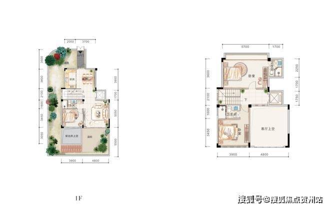 (2)下叠户型含独立前院、L型厨房及私家花园,空间布局清晰。
