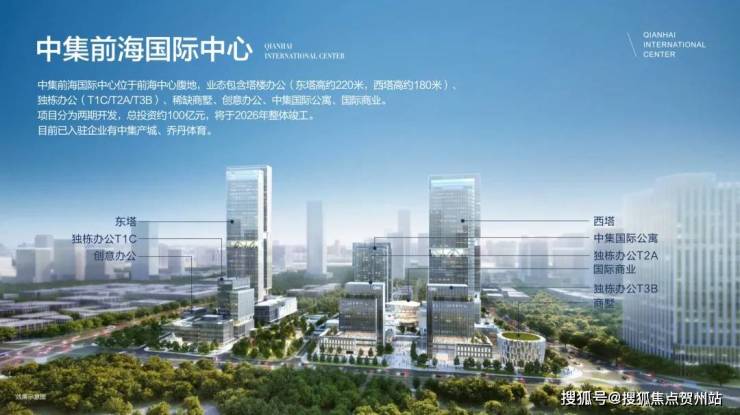 作为前海前湾片区的地标建筑之一,中集前海国际中心项目占地面积约6.01万平方米,总建筑面积接近50万平方米,总投资约100亿元,属于双地铁上盖低密度生态产城融合综合体,业态包含塔楼办公(东塔高约220米,西塔高约180米)、独栋办公、创意办公、国际公寓、集中商业等。