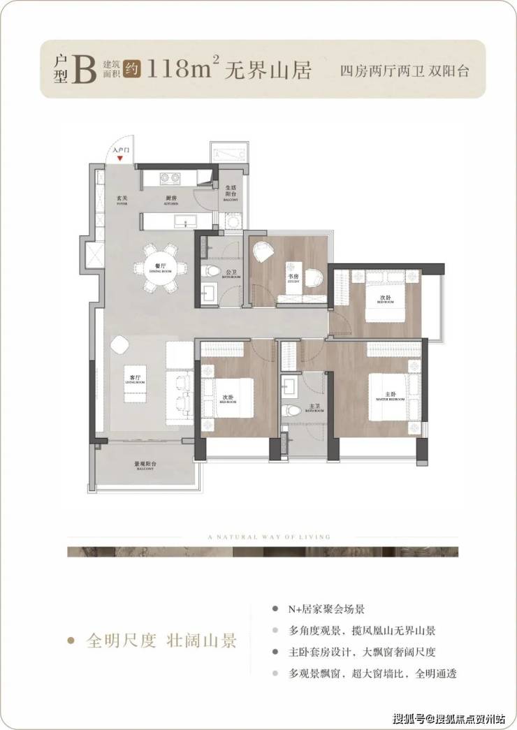 户型背山面海,超大的窗墙比将窗外无价的山海资源揽入户内,所有户型都可以看到开阔的山景,部分户型高楼层可以同时看到山海景观;南向大面宽、小进深,结合现代人家居理念的LDKB一体化设计,打造城市之芯的巨幕山海。