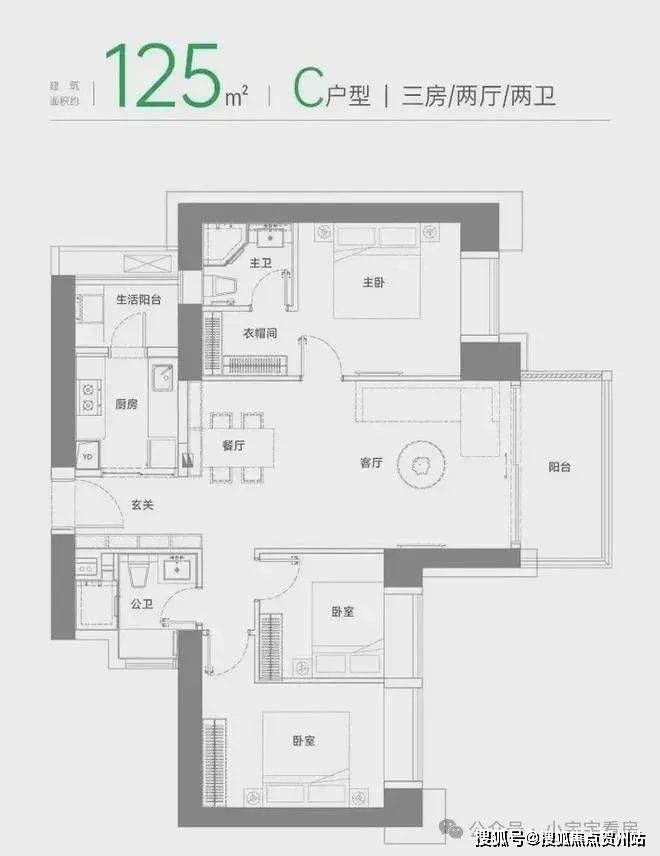 C户型建面约125m²三房两厅两卫
