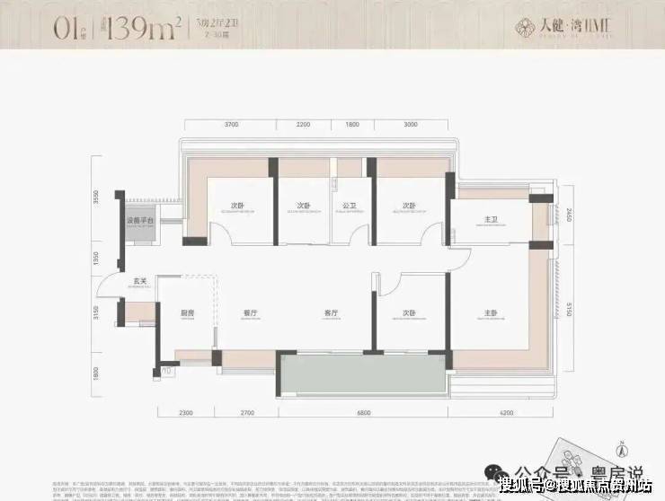 139㎡5房2卫,竖厅户型,朝南看海,户型结构和115接近,多了一间朝南卧室,主卫做了双面凸窗;