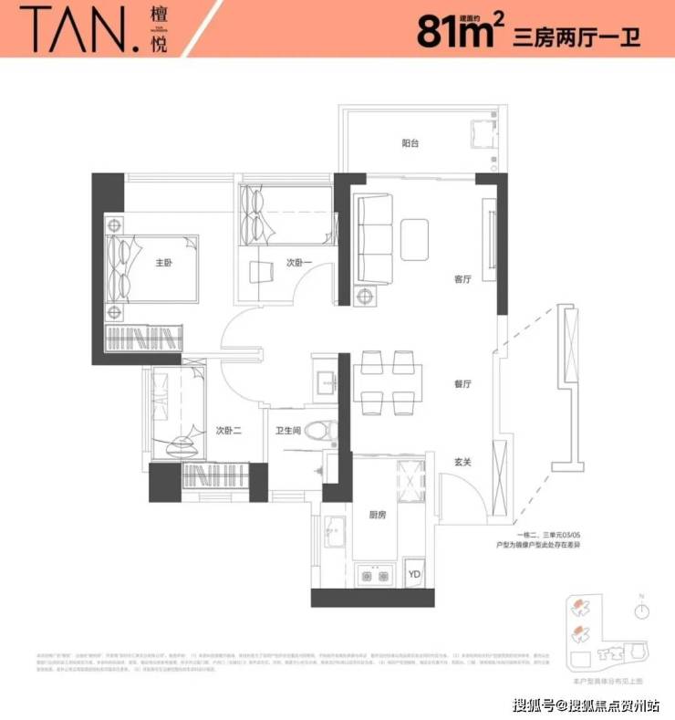 81㎡的3房2厅1卫,设计的是竖厅格局,进门入户玄关,客厅3.5米开间,LKDB一体化设计,有1个次卧做的双飘窗,U型厨房,卫生间三段式分离,得房率:74.34%(不含赠送),全部西北朝向。