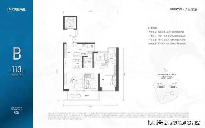 113㎡的3房2厅2卫:位于2-30F,全朝南向,带6.5米宽大阳台。