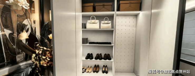 地面做了拼花工艺,贝壳镶嵌的房号藏着轻奢质感,一侧可定制整面鞋柜+储物柜,放下全家的鞋履、婴儿车甚至露营装备;另一侧留着明窗,摆上绿植、艺术摆件,或是做个小型换鞋凳,瞬间变成进门的“第一印象区”。值得一提的是,入户花园的设计融入了保利“超级符号”元素,线条感与实用性兼具,细节里都是央企的审美底气。