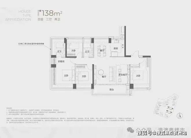 竖庭格局,西南向,基本居住功能与建面约108-110㎡4房2卫一致,但格局不一样,从目前公布的户型图上看,主要是主卧空间有了更大的提升,比如可以放更大一点的衣柜。但从位置上看,它所在的楼栋更靠近主干道,会有噪音影响。