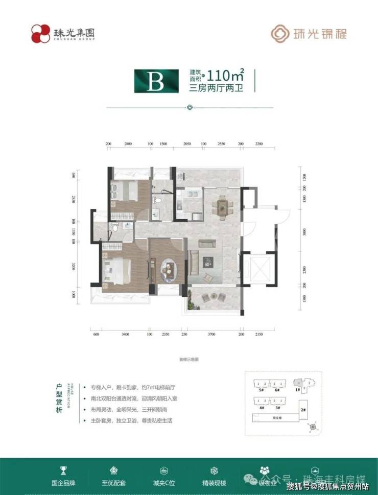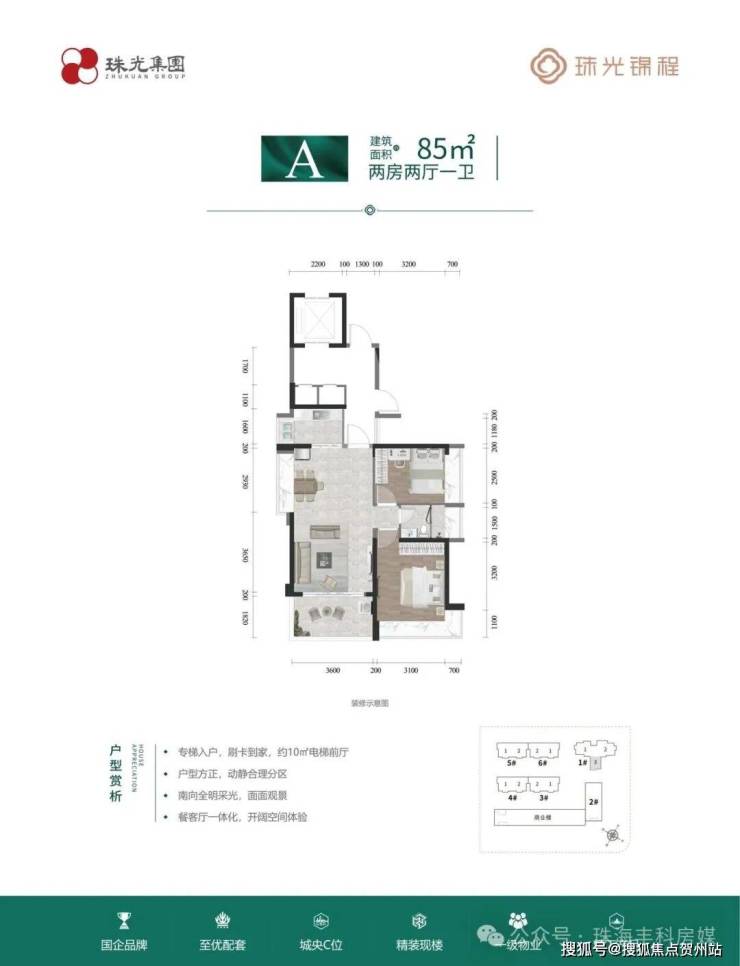 【首推产品】:首推 1 栋、6 栋。1 栋为 23 层,两梯三户, 85-110-115 m²精装二至三房;6 栋为 17 层,两梯两户板楼, 120 m²精装三房两厅两卫