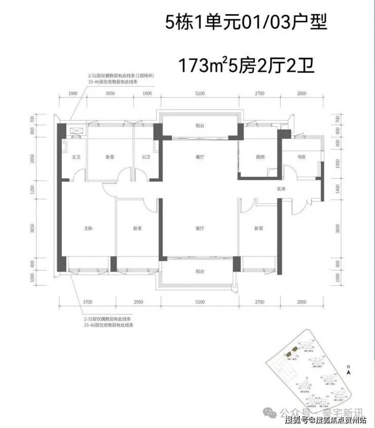 【五栋一单元-平面图】3梯3户,3条腿,分别是01、03号房户型约173㎡的5房2厅2卫、02号房户型约149㎡的5房2厅2卫