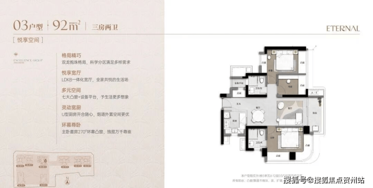 其中, 项目最小面积 92 ㎡产品, 做到了双龙抱珠的户型设计, 充分将户型内部空间进行展开, 优化