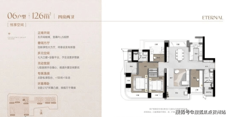 126 ㎡产品为进阶客户的绝对选择,户型整体做到南北通透的同时,还保证了 5 空间南向的舒适体