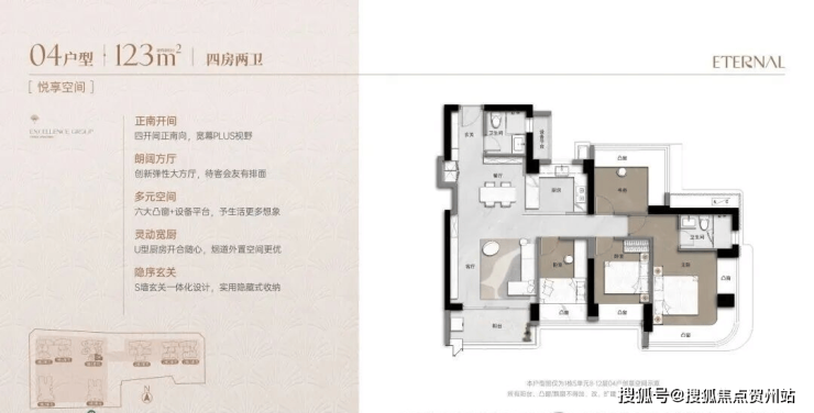 项目 123 ㎡产品,实现了 4 房空间构造,同时还保证户型南北通透同时 4 个空间为南向开启,产品