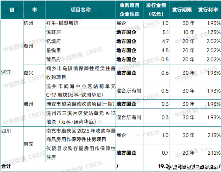 从金额来看,浙江、四川两地用于收购存量商品房的专项债券分别为17.5亿元、1.7亿元,分别占各省当期发行新增专项债券的3.2%、0.6%(浙江、四川当期分别发行新增专项债券552.7亿元、284.3亿元),合计发行金额19.2亿元,整体规模不高。