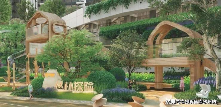 设置瞭望塔、树屋、攀岩墙等分龄段游戏区,高绿量的户外亲子互动场地。