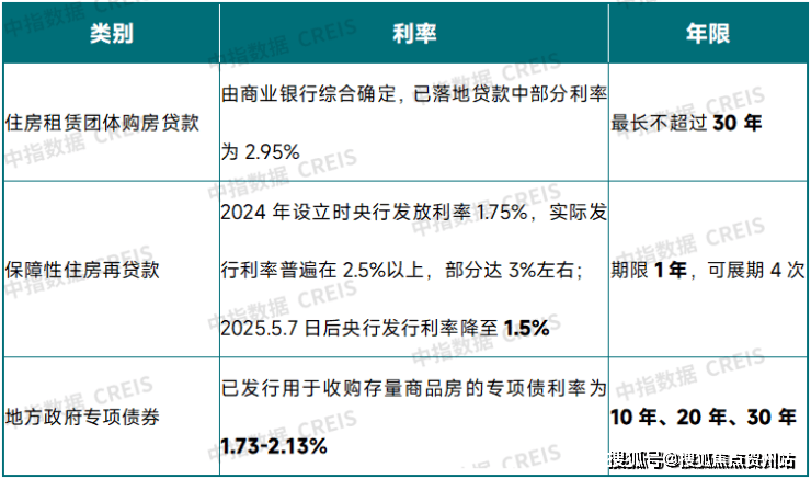 保障性住房再贷款:2024年5月设立时央行发放的利率为1.75%,期限最长为5年(展期4次),期限较短,21家全国性银行向各地国企发放资金时通常要在1.75%的基础上加点,实际发行的贷款利率整体或在2.5%以上,部分甚至接近3%;2025年5月7日央行下调结构性货币政策工具利率0.25个百分点,保障性住房再贷款利率降至1.5%;