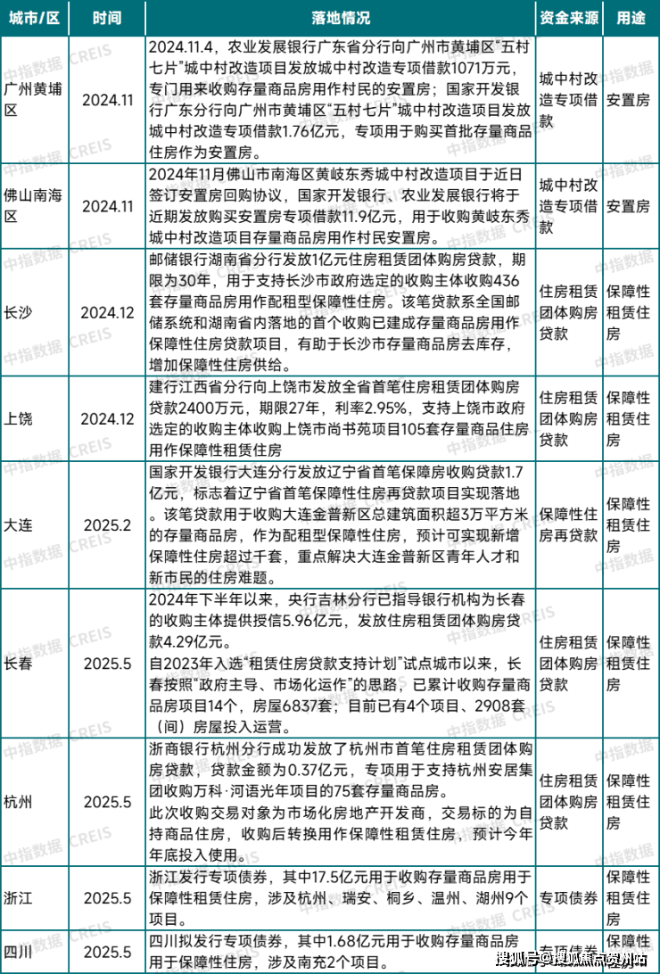 2024年四季度以来,部分城市通过一些创新举措在收购存量商品房方面取得了一定效果。如广州、佛山将收购存量商品房与城中村改造相结合,广州、佛山部分城中村改造项目使用城中村改造专项借款收购存量商品房作为安置房,一方面加速了城中村改造项目的推进,另一方面也助力库存去化。据报道,截至2025年5月30日,黄埔全区通过“房票安置”模式累计完成认购商品房1100余套,去化面积近10余万平方米,拉动资金流转超20亿元。