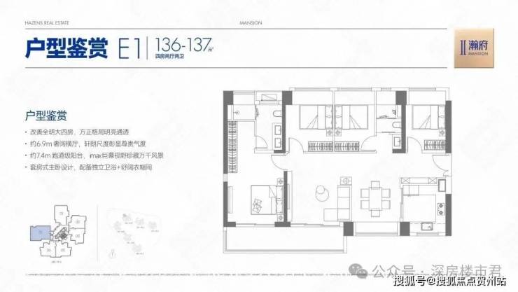 136-137㎡4房2厅2卫07(E1)户型,设计的是横厅朝西南,客餐厅开间6.9米开间,LDKB一体化设计,四开间朝南,全屋7面飘窗,主卧套房+步入式衣帽间,3个次卧朝东北向,客厅连接次卧出7.4米长的超大阳台。