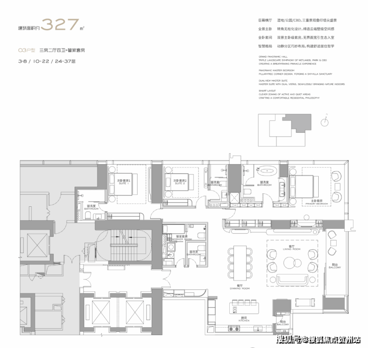 (3-57层)T3栋 四房四卫+家政套间。中西厨分区,餐客西厨一体,带多功能房。端头位置,三面采光。功能完备,房间数充足;实现了主仆双动线;会客观景视野一流。