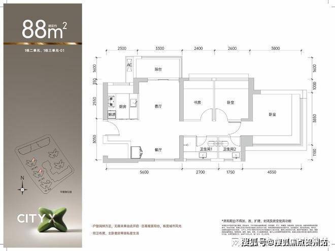 88㎡三房两厅两卫 :(双娃家庭置业首选)南北通透双厅设计 户型方正百变空间 双卫设计宜居便利 主卧270°宽景采光。