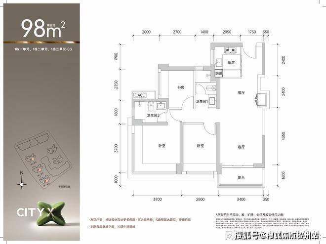 98㎡三房两厅两卫:(舒居三口之家首选) 空间奢阔静谧舒居 全南向客厅及卧室 公卫干湿浴三分离 主卧270°巨幅视野。