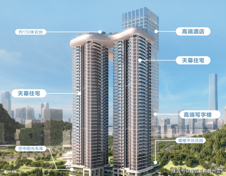 空中还设计了一个约150米高的云台,并配有高端酒店、荧光跑道和无边际泳池,揽山瞰海,景观视野无敌,享有“一览众山小”豪迈的人生体验。