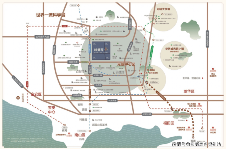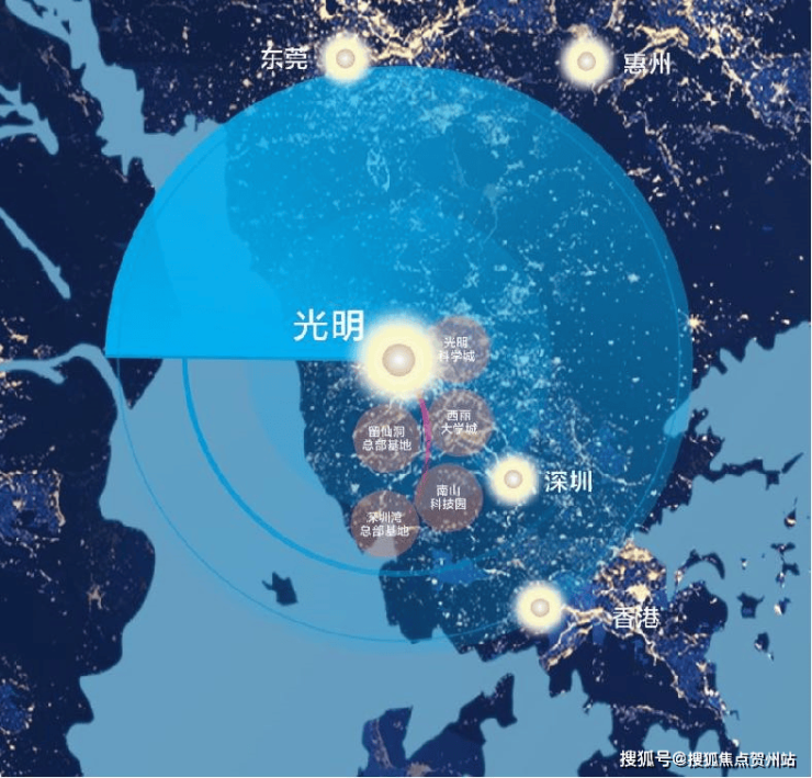 光明——湾区黄金轴线的又一个战略节点,引领深圳从城市科技园走向国际科学城。光明南接深圳南山科技园,北联东莞松山湖,向上链接东莞水乡新 城和广州大学城,是粤港澳大湾区的重要战略节点,占据中国科创发展大动脉。