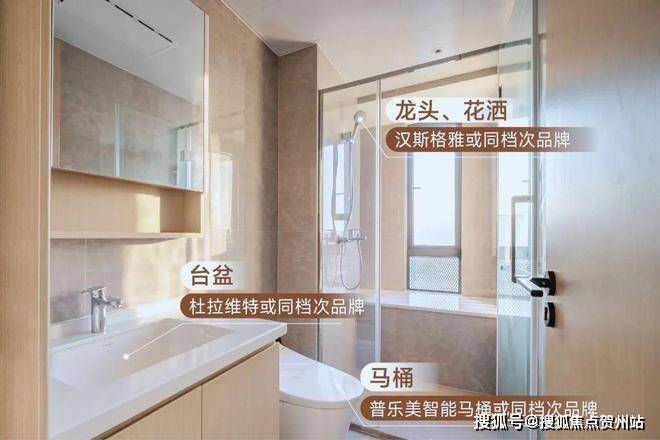 其中,全屋卫浴赠送全屋智能马桶,配备汉斯格雅、杜拉维特(或同款品牌)等五金洁具;
