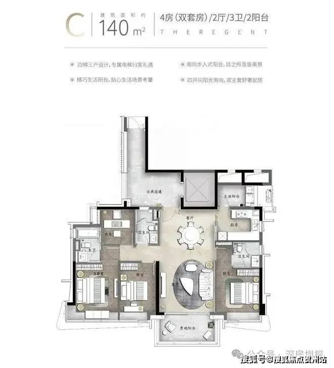 产品亮点:私家电梯入户、约3.4米层高、动静分区南北对流、约6.8米挑空餐客厅、中西双厨、三套房设计、部分房间带阳台设计