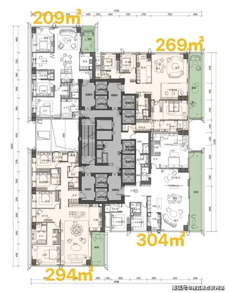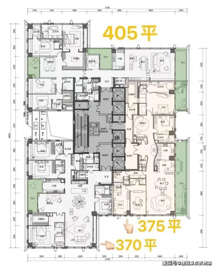 高区42F起(150-200米)是约370-375-403㎡4+1房五卫+家庭厅+家政套间;