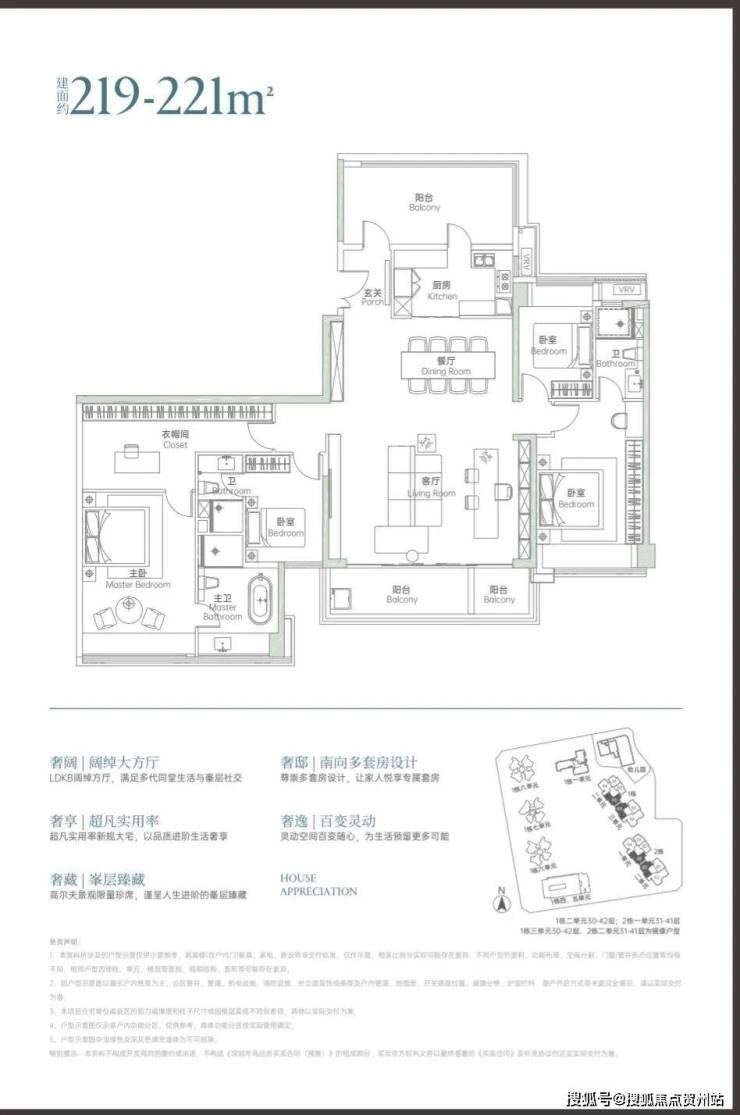 219-221㎡户型是项目的 “入门级豪宅”,仅在高区分布,为5 房 3 卫 + 3 套房设计,定位高端改善或轻豪宅需求。