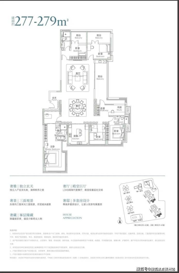 作为项目的 “顶流户型”,277-279㎡ 6 房 4 卫仅在高区分布,且仅有 “两条腿”,东南朝向(比 219㎡户型朝向更优),是妥妥的 “终极改善款”。