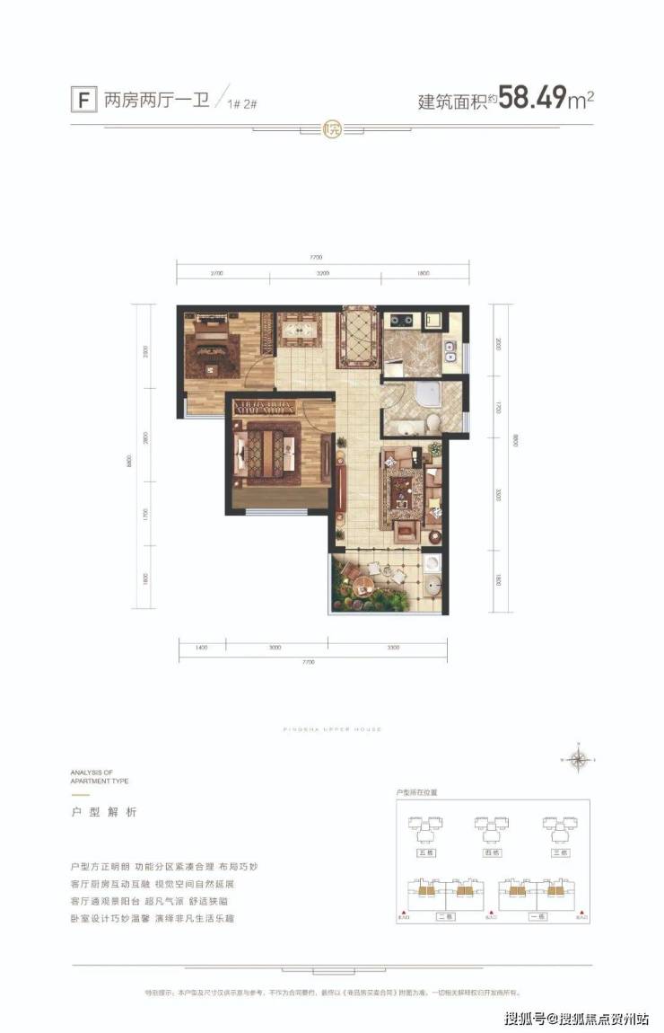 F户型面积:建筑约58㎡ 2房2厅1卫
